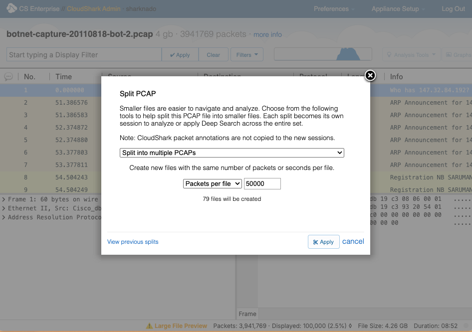 When a capture file exceeds a configurable packet limit, CloudShark automatically opens it in Large File Preview mode, loading only a subset of packets to keep the system responsive. Administrators can configure the threshold from 10,000 to 500,000 packets.